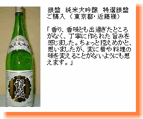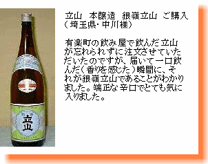 本醸造 銀嶺立山は、1980年代頃、関東・関西圏ではプレミアムがついて1本8千円〜1万円で売買されていたお酒。 |