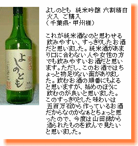 コストパフォーマンス高し。 「純米大吟 米の芯」は、まさにジャパニーズライスワイン。シルクを連想させる柔らかな口当たりを常温で是非。 |