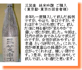 日本酒の芸術作品。 吟醸蔵の雄。この蔵が醸す吟醸酒系の気高さは、日本酒の芸術と呼びたくなる素晴らしさ。 |