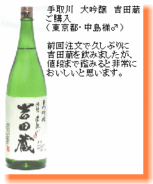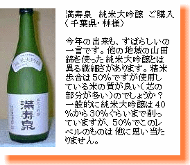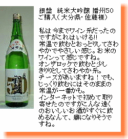 日本酒の芸術作品。 吟醸蔵の雄。この蔵が醸す吟醸酒系の気高さは、日本酒の芸術と呼びたくなる素晴らしさ。 |
