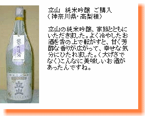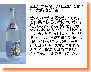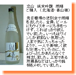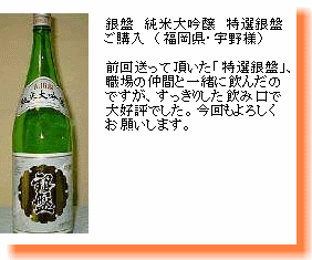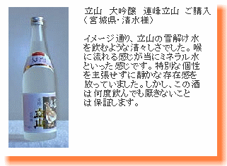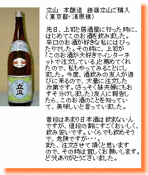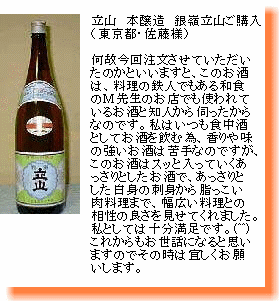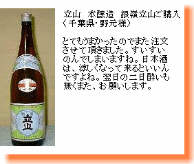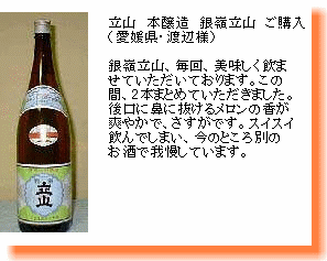 本醸造 銀嶺立山は、1980年代頃、関東・関西圏ではプレミアムがついて1本8千円〜1万円で売買されていたお酒。 |